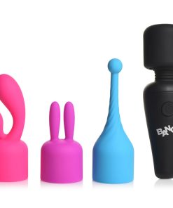 Try out this power packed wand with three different attachments! Each attachment slips onto the head of the wand and transfers the rumbling buzzes into the attachment for specific and different sensations! Try out the blue, pinpoint attachment to get to a specific spot on your nipples or clitoris. Use the purple rabbit ear attachment to buzz either side of your clitoris or nipples for a slightly less focused and intense buzz. Use the pink rabbit-style and G-spot targeting attachment for inner and outer pleasure! Or simply use the wand on its own to feel the full power of 3 speeds and 7 patterns of vibration! Made to be small and compact this little wand is perfect for overnight stays and is travel-friendly! The silky smooth silicone is premium quality and phthalate-free so you can enjoy body-safe and worry-free play. Use only with water-based lubricants for best results. Recharge using the USB cable provided. To clean, wash with warm water and mild soap then rinse and spray with a toy cleaner before wiping dry. Store in a cool, dark place separate from other silicone toys.