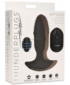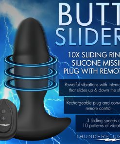 For those who are experienced, anal enthusiasts this is a delight for your derriere! This sliding ring Missile Plug is perfect to load your back cannon with and enjoy the massive sensations from the stretch and sensations! Made out of premium, phthalate-free silicone, the plug is firm with a ring beneath the silky smooth surface. Enjoy 3 speeds of sliding as the ring moves across the plug while inserted. The slightly tapered, round tip assists with insertion and then you can enjoy up to 4.8 inches of length and 1.9 inches of width that opens you up inside. This backdoor missile also rumbles with 3 speeds and 7 patterns of powerful vibration for you to enjoy! Rated IPX5, it is splashproof and can handle fluids and spills but should not be submerged underwater or taken into the shower. Use the battery-operated remote to control the functions so you don’t have to fumble with the controls once inserted. Use with water-based lubricants only for best results. Recharge using the USB cable included. To clean, wash with warm water and mild soap then spray with a toy cleaner and pat dry.