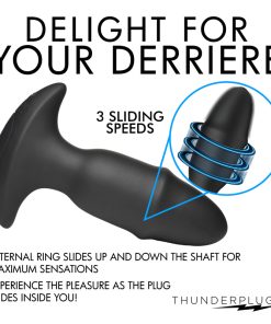 After warming up your derriere with small and medium sized plugs, you’re finally ready to use a larger one. You take your time and relax. First you pair the remote with the plug so you can control it hands-free. You don’t want to deal with highly lubed up fingers when trying to change the settings! With lots of deep breaths, squatting and relaxing, you finally slide the plug inside. You move and stretch, feeling the expansion inside your rear and thoroughly enjoying how it pushes against all your most stimulated spots deep inside! You feel excited and begin to play with the settings. The sliding feature massages you in a way you can barely describe, the plug remaining still but moving and writhing inside. The vibrations add a buzzing rumble that makes you feel hot and tingly. You feel the vibrations through your pelvis and other nearby areas. As you touch your body, your senses awakened, you smile both at the triumph of fitting this missile inside and because tonight is going to be one hell of an experience!