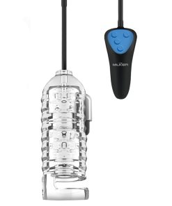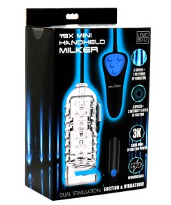 This small but mighty handheld milker is perfect as a discrete and powerful masturbation toy! Use some water-based lube and slip on the clear, stretchy, TPE sleeve and pull the ball strap around your testes to keep it in place. Connect the tube to the head of the sleeve and slip the powerful bullet vibrator into the pocket of the sleeve. Then enjoy intense milking via the suction and vibrating features! Use the mini, handheld remote to choose the intensity you desire. Enjoy 3 speeds and 7 patterns of buzzing vibration against your shaft! Explore all three levels of powerful suction and get up to 3,000 RPMs of suction on the highest setting! With a liquid chamber in the middle of the suction tube, you can also rest assured that clean up will be easy. That liquid chamber will stop any extra fluid from going too far down the tube. The sleeve itself is also easy to wash; use warm water and mild soap on everything, rinse and then spray with a toy cleaner before letting air dry. Do not submerge the remote or the bullet vibrator.