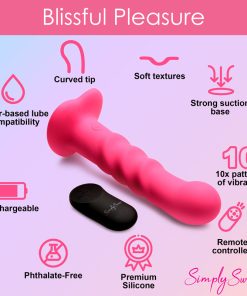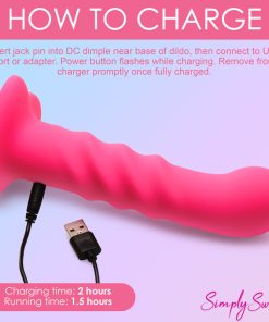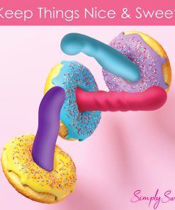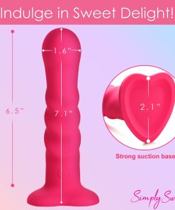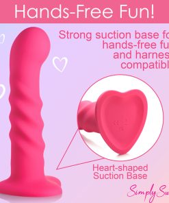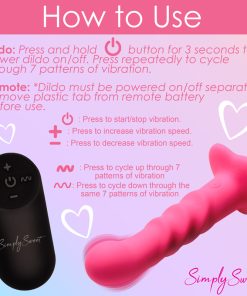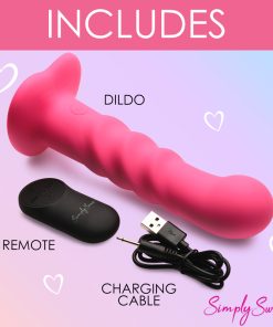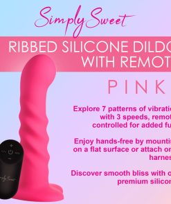 Bring something sweet into your sexy collection with the Simply Sweet ribbed dildo! Not only does this pink dildo have a round head that helps stimulate the G-spot or P-spot, a set of 3 pronounced ribs that add tantalizing texture and is made out of super silky silicone, it’s also a vibrator! Indulge in 3 speeds and 7 patterns that add intensified pleasure to your penetrating poundings! Control all the settings with a battery-operated remote control that can be used from up to 26 feet away! Made out of premium silicone, it is phthalate-free and body-safe to use with any water-based lubricant. The wide, heart shaped base is compatible with most strapon harnesses and has a suction cup so you can ride hands-free, too! Want to get really wet and wild? Rated as IPX7 waterproof it can handle being underwater for up to 30 minutes, so you can bring it in the bathtub for short term play or in the shower for long, steamy sessions! After use, simply wash the warm water and mild soap, then spray it with toy cleaner and let it air dry. Recharge using the USB cable provided. Replace remote control batteries as needed.