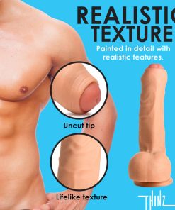 Do you love a man with a meaty, uncut dong? This dildo celebrates those who have a turtleneck around the head. Hand painted to look excellent up close so you can live out your fantasies without distraction, it is made out of super soft, stretchy and flexible TPE rubber. The skin at the tip folds over the corona of the head, is veiny along the shaft, and slim. At the base are wrinkled balls to bounce on when riding it. Enjoy it hands-free by pressing the super strong suction-cup onto any flat surface. INvite your partner to play, too! This dong is strapon harness compatible for couples play and pegging. To wash, use warm water and mild soap then rinse and spray with a toy cleaner. Keep out of direct sunlight and away from heat. Use only with water-based lubricants.