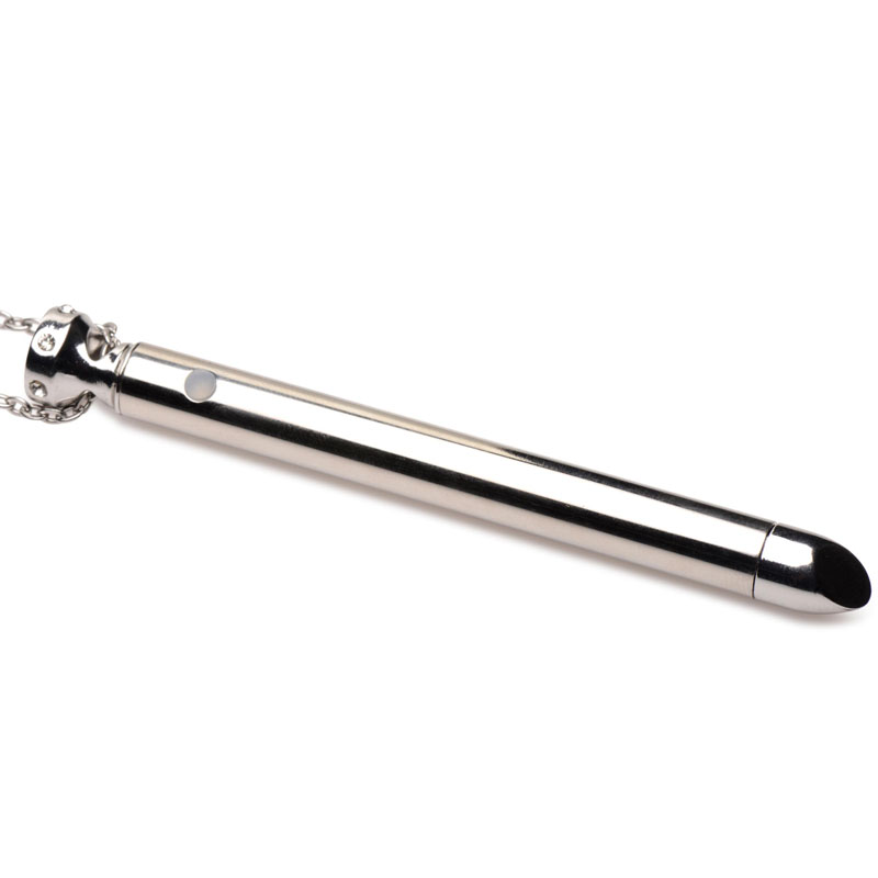 Dare to wear your favorite vibrator right around your neck! The sleek, sexy and stunning metal and rhinestone gem vibrator is made of nickel-free metal for sensitive skin and packs powerful vibrations. Choose from 7 different vibe patterns that you can feel along the shaft and in the pinpointed, smooth, round tip. Recharge using the toy-specific, USB charging cable when not in use. Wash with warm water and soap, then spray with a toy cleaner and wipe dry.