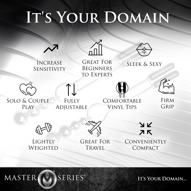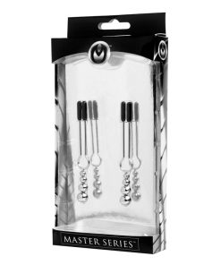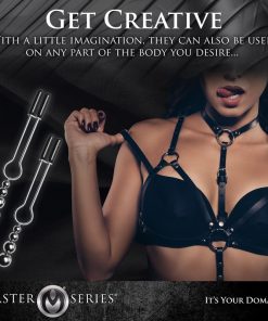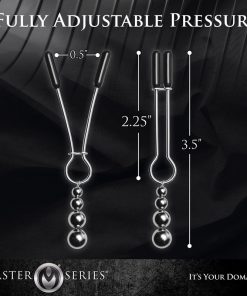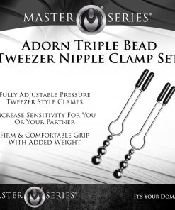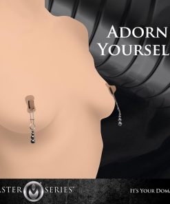 These tweezer style nipple clamps adorn the chest with three graduated silver balls that dangle from the end. The adjustable clamps have a sliding ring that will allow you to modify the amount of pressure that is applied, and are coated with vinyl for comfort and a better grip. These beaded clamps are ideal for beginner or advanced nipple play. With a little imagination, they can also be used on the scrotum, penis, labia, ears, or any part of the body you desire…