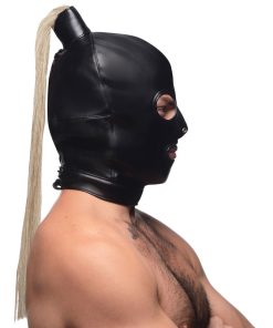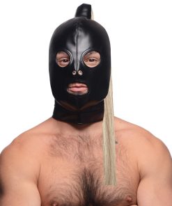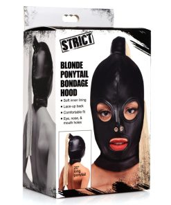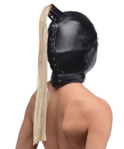 Fulfill your fetish fantasies with this soft leather hood that hides the face while keeping eyes, nose and mouth free! A long blonde wig is attached to the top of the hood for an enchanting effect. This hair can also be used for sensation play the same way you’d use a feather tickler.