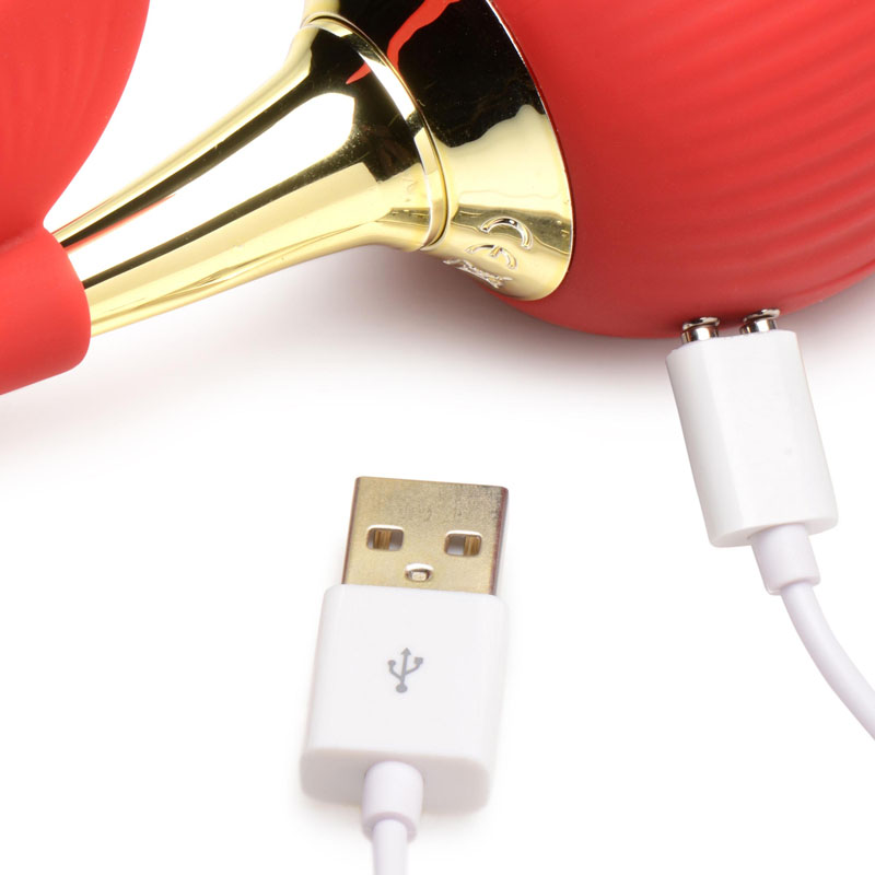 This fluttering butterfly, golden rod, and red rose are both pleasing to the eye as well as your vulva! The plush red petals of the rose are made of plush, premium, phthalate-free silicone and have a small, round hole that gently sucks at the clitoris using air-stim technology. Enjoy 10 different suction modes to tease and tantalize your little pearl. The stem of the rose is a golden rod with a round, beaded tip in the shape of a ball. Delight in an extra 10 vibration modes to enhance your pleasure as they rumble down the shaft of the stem and directly into the rod. The design of the stem allows you to pinpoint your pleasure points with targeted vibration for personalized satisfaction.