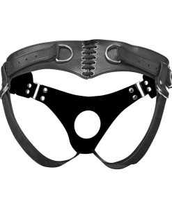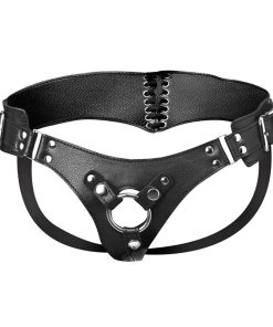 This enticing corset back dildo harness will look absolutely stunning on almost any body type! With adjustable buckles at the hips, sliding D-ring buckles at the buttocks, and a lace up corset style closure at the back, you can find your ideal fit. The corset back arches and curves around your body, creating an irresistible heart shape. The material is vegan-friendly and incredibly comfortable, with a realistic leather-like look. The front has an open hole with three snap straps that support the metal O-ring.