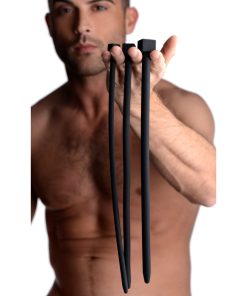 Flexible, smooth, and enormous! Made of high-grade silicone, this extra long sounding set is non-porous and phthalate-free, making it a body safe material that you can trust. Each sound has a tapered tip for easy and comfortable insertion. Experiment with three different diameters and all the length you could possibly want! The silky, seamless material is extremely flexible to conform to the unique curves of your shaft. Not compatible with silicone lubricants. Clean with mild soap and warm water before and after each use.