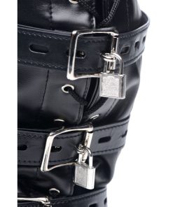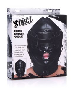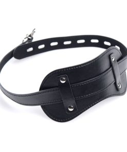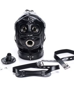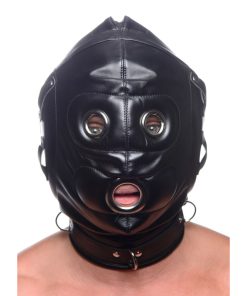 Create a customized sensory experience for your plaything! How much will you deprive them of? This hood has padded ears to take away your partners ability to hear, so that they will not be able to hear the swish of the flogger or the flick of the crop before you hit them. While there are three holes for their eyes and mouth, a blindfold allows you to take away their sight, so that your slave will be surprised by every touch and tickle. A penis-shaped gag even allows you to stuff their mouth so that every sound your partner makes is muffled and they cannot beg for more! Both accessories adjust and have locking buckles. The collar, which has 3 D-rings for attaching other BDSM accessories, also adjusts with a locking buckle. Tighten the back laces to fully confine your pet in the versatile hood, and then enjoy having your way with them!