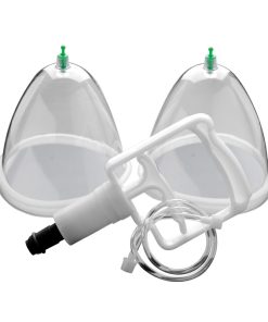 Create temporary engorgement of the breast area with a hand-pumped cupping system! Each of the two large cups has a rubber ring around the base to create a strong seal when you place it on your skin. Attach the green end of the tubing to the green tips of the cups and the white end of the tubing to the hand pump. Pull the pump trigger to create suction, working towards your comfort level. The tubing can be removed and your flesh will stay caught in the pressure of the cup. Press down on the green tip to easily release the suction. Experiment with enlargement and increased sensitivity on your own or with a partner!