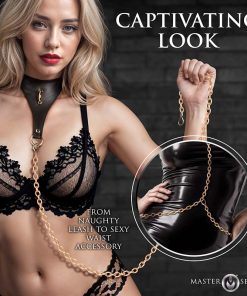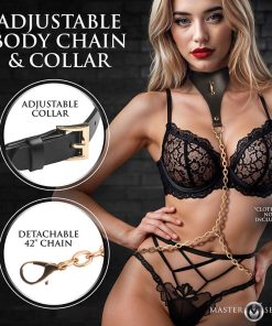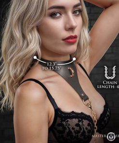 Elevate your kinky wardrobe with this sexy, vegan-leather bondage collar. Designed for ultimate comfort and adjustability, it features golden buckles to ensure the perfect fit for any neck size. This stunning collar is equipped with two D-rings — a large one at the front and a smaller one at the tip of the vegan-leather strap— ideal for attaching your favorite implements, chains, or accessories. The included detachable chain leash is perfect for guiding your submissive partner or wearing as a fashionable waist accessory. All metal components are nickel-free, making this collar not only stylish but also body-safe for everyone.