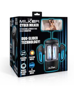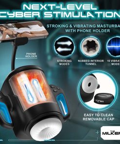 • Introducing the Cyber Milker, the future of self-pleasure. Equipped with a phone mount, it keeps your device steady as you dive into erotic content or chat live with your partner. Use the handles and buttons on each side of the device to tailor your experience with 3 vibration speeds, 7 tantalizing patterns, and 6 stroking modes. Elevate your session with its self-heating feature, capable of turning the temperature up to 98.6°F or 107.6°F. The device is crafted from soft, stretchy rubber with textured nubs and grooves inside that massage your shaft with each stroke. Clean it effortlessly with the removable clear front cover. Its IPX6 waterproof rating and USB rechargeable design make it a durable and convenient companion that is easy to clean and safe to use.