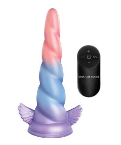 Unleash your fantasies with this enchanting unicorn horn dildo, beautifully hued in purple, blue, and red. The tapered tip makes for easy insertion, while the spiraled ribs offer intensified sensations along the shaft. Enhanced with charming pegasus wings and a strong suction-cup base for hands-free use, it’s crafted from ultra-smooth, premium, body-safe silicone. Experience powerful vibrations with 3 speeds and 7 diverse patterns, easily controlled via a wireless remote. Enjoy uninterrupted pleasure sessions with its USB rechargeable design, ensuring both the dildo and remote are always ready for action.