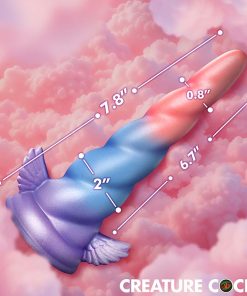 Fantasy Dildo: Experience the fantasy with this eye-catching unicorn horn dildo, beautifully colored in purple, blue, and red. Its tapered tip facilitates easy insertion, and the spiraled ribs along the shaft heighten your sensations. Decorated with small pegasus wings, it boasts a sturdy suction-cup base for hands-free thrills.