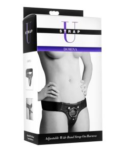 Indulge in your strap on fantasies with this fully adjustable and comfortable dildo harness from Strap U. With a wide band supportive harness that adjusts via two Velcro straps, you can insert your favorite flared base dildo into the O ring. Just snap it into place and you are ready to start penetrating your partner with the dildo of your choice! The waistband offers total adjustability, and will accommodate most sizes. The back supporting strap offers a more form-fitting design that hugs the contours of your body, allowing you to move freely. The snap-in design allows you to change out the included ring with one of your own, if you desire a different size or material. Most cock rings will work perfectly! This harness system is easy to maintain, making this an ideal choice for all your strap on adventures.