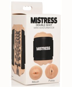 Pump your passions into this Double Shot stroker! It has a mouth and vulva for your pleasure that allow your fantasies to run wild with hundreds of scenarios. The tight, textured tunnel in the center has ridges, grooves and is stretchy and realistic feeling for a satisfying solo session. You can also use it with a partner to enhance foreplay and sexy fun! The luscious lips beckon you as does the open mouth. Made of stretchy, soft, realistic feeling TPE rubber, it offers a fantastic feeling every time! Designed to be easy to travel with and use, take it on the go with you or during travel! With open-ends on each side, you can plummet your peen through the hole or deeply into it and let yourself release through the hole as you wish! To clean, just rinse it out and use mild soap and warm water, then let it fully dry. Two caps are included – one for each end – and can be used as something to bump your head against if you want a little resistance. Enjoy the ridges, bumps and nubs from the stretchy and realistic stroker and only use water-based lubricants for best results!