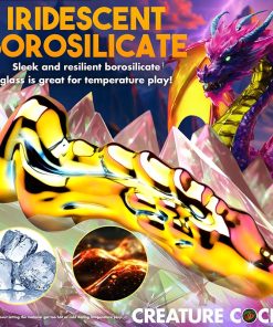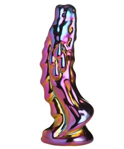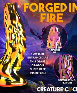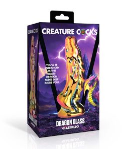 Experience mythical pleasure with the Dragon Glass Glass Dildo. Its design, reminiscent of a dragon’s head and neck, features an arched curve, a delightfully bumpy spine, and a tapered tip, all in an iridescent metallic yellow-pink shade with blue dapples. This beautiful toy is made from sturdy borosilicate glass, ensuring it is non-porous and compatible with any lubricant. Notably heat-sensitive, it adapts quickly to your body’s warmth. The unique texture is crafted to rub and stimulate your erogenous zones, providing endless pleasurable possibilities.