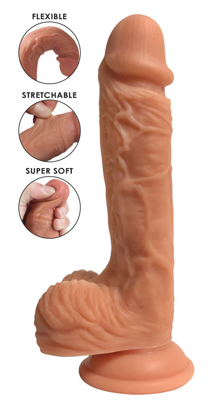 Insert the bulbous head past the bold coronal ridge, take on the veiny shaft, and bounce up and down on those balls! This lifelike dildo is made with ultra-premium silicone to give you a lasting pleasure tool that you can trust. The defined head and bulging veins combined with the dual-density material make this dong look and feel like the real thing… or maybe even better! The strong suction cup base sticks to just about any flat surface so that you can it for a ride. You can even warm it up or cool it down for a variety of sensations. The hypoallergenic material is easy to clean with mild soap or a toy cleaner, but it is also top-rack dishwasher safe. Use with only water-based lubricants.