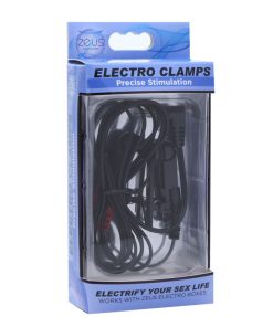These two lightweight plastic clamps with rubber on one edge feel very sexy to even wear alone. They do not pinch very tight, making them great for use on the most sensitive private areas. They can stimulate great pleasure if used correctly. The design makes it easy to use with or without other accessories. One set of two clamps works on one circuit. One clamp is the negative pole and the other positive. They’re compatible with all Zeus Powerboxes.