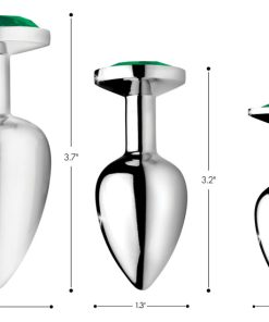 Train that booty with 3 beautiful metal plugs adorned with sparkling emerald gems! Bend over and surprise your partner with a peek of green between your cheeks. Three different plug sizes allow you to take anal play at your own pace, or choose based on what you are in the mood for! Pop in each sleek plug to appreciate the comfortable weight inside your body, thanks to the nickel-free aluminum alloy material. Great for temperature play, you can warm or cool them in water before insertion. The glimmering jewel at the base will draw your partner in to give you more anal attention and pleasure. Use with any lubricant of your choosing and clean after use with mild soap or toy cleaner.