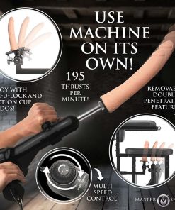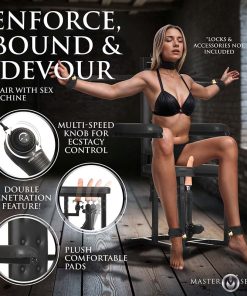 Elevate your bondage sessions with the Enforcer Chair! Featuring a robust steel frame and plush cushions covered in easy-to-clean, vegan-friendly leather, it guarantees durability and comfort. With seven D-rings, you can secure cuffs, straps, and other accessories in multiple positions. Have your submissive partner use the adjustable arm bars or the armrests and attach cuffs to the D-rings to keep them in place. Attach their ankles to the D-rings at the base to have them completely restrained. If their height and comfort level allows you can even attach their collar to the back of the backrest to create an extreme form of restraint! Enjoy dual stimulation offered by the auto-thrusting, motorized sex machine alongside a stationary dildo on the DP attachment. Achieving up to 195 thrusts per minute, it’s fully adjustable via a speed dial that you can easily control to create variety! Plus, its detachable design allows for convenient handheld use as well. It comes with one, premium quality, phthalate-free, body-safe silicone dildo for your pleasure. However, the DP attachment and sex machine are both compatible with Vac-U-Lock dildos and dildos with suction cup bases so you can customize and personalize your experience! Choose to take away all the dildos and you can still enjoy the chair in its original form by teasing and tormenting them and playing with their sensitive private parts for your own enjoyment! This chair turns any scenario into an exhilarating experience and is sure to upgrade your kinky collection!