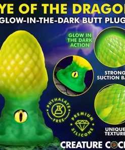Key Features: Fantasy Anal Toy: This thick, egg-shaped plug has a stimulating, dragon-scales texture and a wide, base with a glass dragon's eye on it. Glow-in-the-Dark: Expose this plug to UV light from natural sunlight or a flashlight to unlock its glowing potential in the dark! Premium Silicone: Made from soft, premium, body-safe silicone. Use only with water-based lubricants. Suction-Cup... Read more