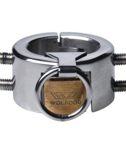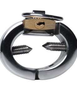 This sturdy, solid CBT device acts as a ball stretcher, scrotum torture device, and ball collar all in one! Snap this heavy metal band in place, and secure it with lock, which is built right into the cuff. There is absolutely no escape once it is locked into place. The larger size allows for ultimate restriction and security on bigger girths, or for more room if you find the smaller version too tight. Four pointed screws line the inside of this devious piece, which can be twisted to apply more pressure. The front features a steel O-ring, so you can lead your pet around with a leash, add ball weights, or lock him in place. Use alone or in conjunction with other toys, this unique CBT toy is as versatile as it is effective.