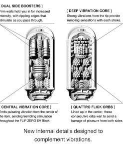 A new generation of Flip Zero is ready to rumble! Rumbling vibrations from within the elastomer sleeve bring a sensation from another world to your hands. This is made possible with yet another TENGA-engineered first: two Vibrating Cores are housed inside the elastomer for direct stimulation! Push the button on the top to cycle through five settings. Th external pressure pads allow you to control the pressure, or squeeze out the internal air to create a strong vacuum suction. Enjoy TENGAs latest take on vibrating pleasure.