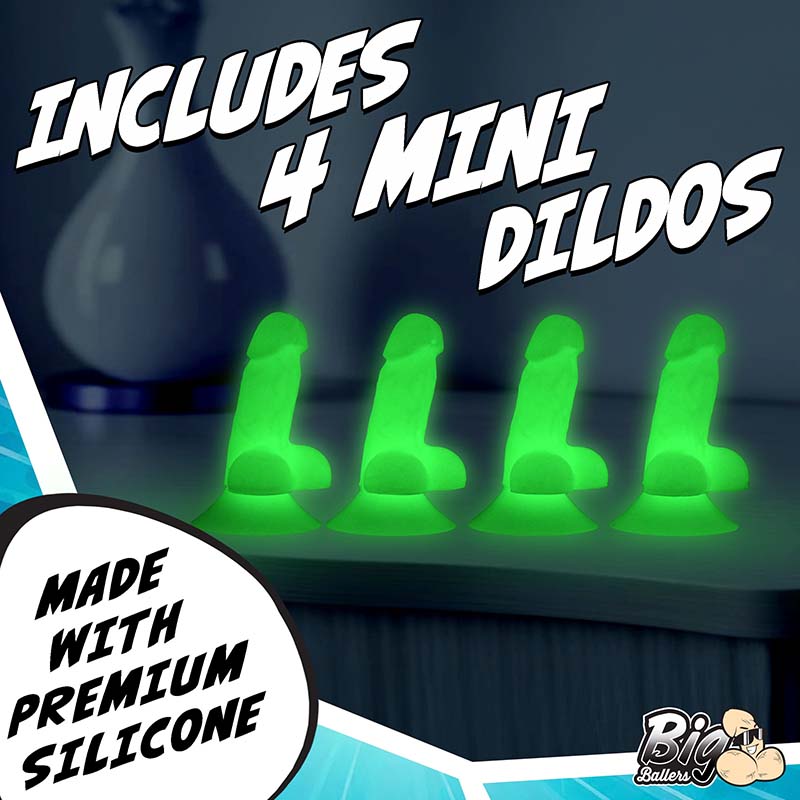 Four Mini Dildos! This fun pack includes four mini dildos that are designed to be noticed and are ready to stand upright on their own. With a strong suction cup base, they easily adhere to most flat surfaces. For added fun, the glow in the dark dildos are eye catching even in the dark! These little novelties make perfect gifts for bachelor or bachelorette parties, playful office decor, or for pranking your friends. Made from premium, phthalate-free, body-safe silicone, these mini dildos combine quality with cheeky fun.