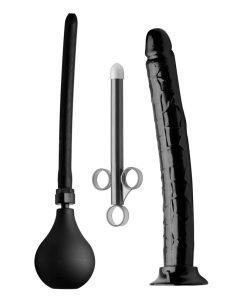 Experience deeper delights with a 4 piece kit that allows you to clean out, lube up, and penetrate your ass! Attach the long, silicone nozzle to the enema bulb to deliver a deep anal douche, cleansing further than ever before. You will love feeling the rush of water far back in your hole! Use the extra large lubricant launcher to shoot your favorite lube far into your ass, ensuring a slick penetration the whole way in. Finally, find out how much of the Tower of Pleasure you can handle! This long, veiny dildo has a suction cup base that can stick to any hard, smooth surface so you can lower yourself onto it. Experience pleasure deep within your body with the perfect kit for those who think bigger is better!