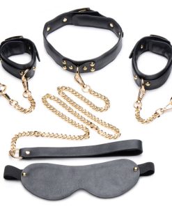 Includes: Blindfold, wrist cuffs, ankle cuffs, and collar with leash
