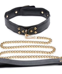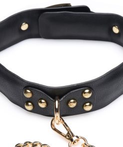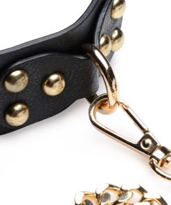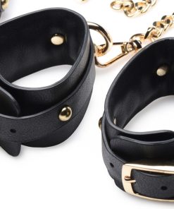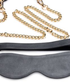 Submit and dominate in style with this regal kit of chains and cuffs! This Golden Submission kit is designed to glam up your dungeon with its golden chains, golden hardware, and sulty black PU leather cuffs and blindfold. Perfect for BDSM players with a penchant for the finer things in life, but still want a set of restraints that can hold up to the usual push and pulls of bondage play!