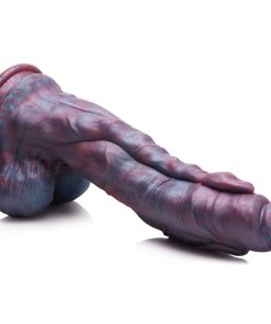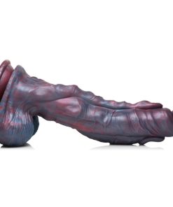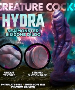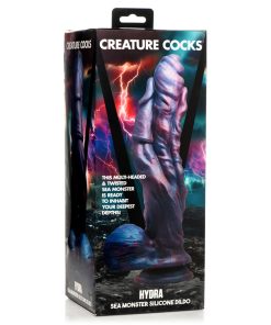 This salty sea monster comes with three heads ready to please and penetrate you! The dark blue and red colors swirling to make an even deeper purple add to the mystical look of this Hydra Sea Monster Creature Cock. The two smaller heads twist around the large one in the center offering different points of pressure and varying textures as it goes deep inside. At the base are a large pair of balls to match this massive 10 inch dildo. Made of premium silicone, it is firm and flexible with a soft, smooth surface. It’s completely body-safe and phthalate-free but must only be used with water-based lubricants. At the wide base below the balls is a strong suction cup that can be placed on any flat surface or hands-free rides. The wide base doubles to make it a strapon compatible dildo, too! Pair it with your favorite strapon harness for pegging play! Perfect for kinky cosplay, fantasy roleplay and for just adding a little more fun and variety to your toy collection! After use, wash with warm water and mild soap, then rinse and spray with a toy cleaner before patting dry. Store separately from other silicone toys out of direct sunlight.