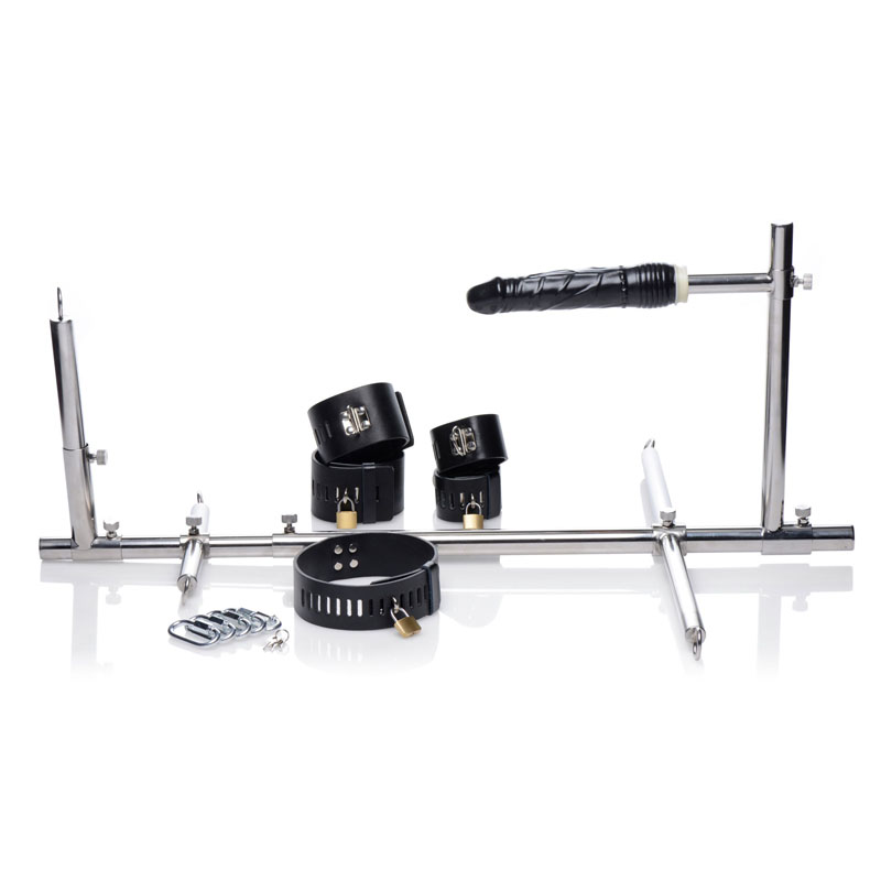 Note: Includes 7 bars to fit together, collar, wrist restraints, ankle restraints, dildo, 5 lock and key sets, and 5 connectors.