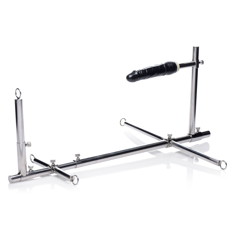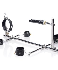 Measurements: Base bar adjusts from 26 to 47 inches. Wrist bar is 10.5 inches across. Ankle bar is 20.5 inches across. Height of dildo adjusts from 1.5 inches from base to 11.5 inches from base. Dildos protrudes 11 inches from bar. Insertable portion measures 7.5 inches in length, 1.75 inches in diameter. Collar adjusts from 13 to 18.5 inches in circumference. Wrist restraints adjust from 6 to 8.5 inches in circumference. Ankle restraints adjust from 6 to 11.5 inches in circumference.