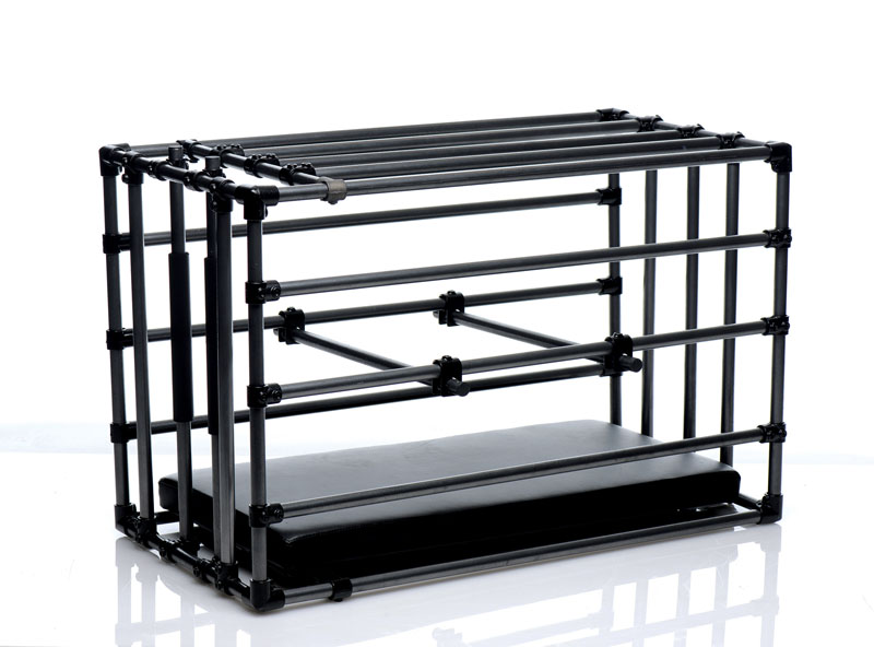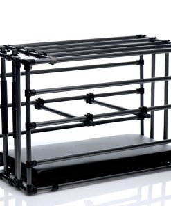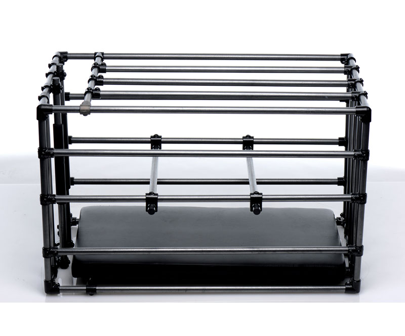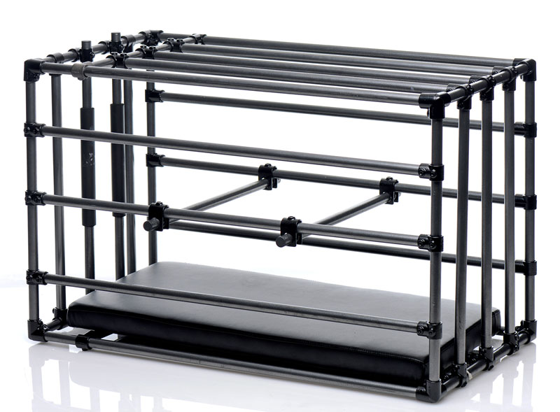 Immobilize your sub in your favorite position! The Kennel is an adjustable cage with a padded board and optional positioning bars. Lock up your plaything within the coated metal enclosure and get creative! Leave in the comfortably padded leather-like board for extended role play sessions or remove it to punish a naughty pet. Positioning bars allow you to prop up their booty, feet, or chin, but you can also use them to keep their head, shoulders, and waist pushed down. Achieve the exact look that gets your blood pumping hardest! Attach their restraints, not included, to keep them in their place. This versatile cage makes an excellent addition to your dungeon or bedroom, creating a striking image as soon as your partner lays eyes on it. Assembly instructions are included.