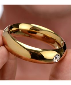 Flash them more than just your hot cock with this attention getting erection enhancer. This golden cock ring is accented with a sparkling gem set deep into the front that will draw their eye right where you want it. The smooth, heavyweight ring provides superior erection enhancement, with its rigid material that can be heated up or cooled down as you desire.