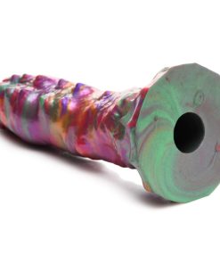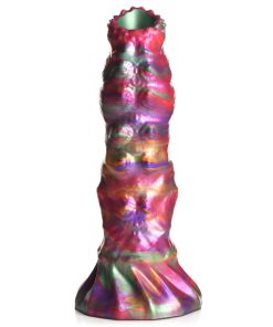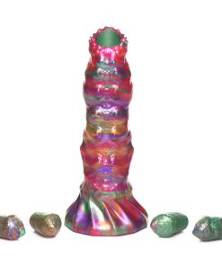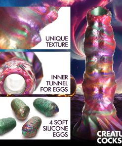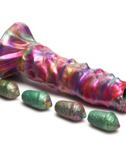It’s time to get bred by alien visitors. This thick, textured shaft from Creature Cocks is one of the most colorful yet with a mix of rich, vibrant, iridescent colors with shades of pink, green, orange and purple. The shaft itself is large and thick with tiny bumps on the head, ribbed texture along the opposite side, and a mixture of textures along the rod down to the wide, suction cup base. It can be used hands-free with the assistance of the suction cup or combined with a compatible harness for penetrating strapon play or pegging! Insert any or all of the four larva eggs into the hollow sheath and then insert them into your hole, letting the ovipositor deposit those eggs to be birthed out of you later after you’re full! Made out of flexible, super soft, premium silicone both the dildo and the eggs are phthalate-free, body-safe, and best used with water-based lubricants only. To clean after, use warm water and mild soap then spray with a toy cleaner before patting dry.