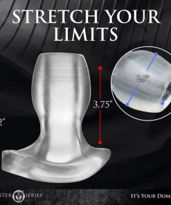 Measurements: Overall length: 5.25 inches. Insertable length: 3.75 inches. Widest insertable diameter: 2.5 inches. Inner diameter: 1.1 inches.