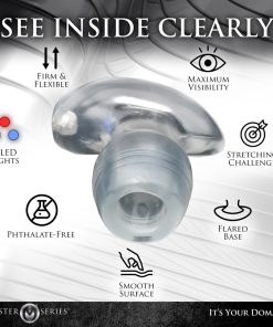 You’re gonna love what’s at the end of this tunnel of light! With this light-up anal dilator, you can illuminate the clear TPE material and see inside that gaping hole as you play! This firm and flexible dilator squeezes inside experienced derrieres for a full feeling that still allows for a sturdy tunnel that you can insert other things into to get deeper inside or enjoy the gaping view! Choose between 3 different color LED lights -blue, red or white- to enjoy adding something special as you look deeper inside! The flared base makes sure it doesn’t slip too far inside and makes it safe to wear for longer periods. To clean it, remove the LED light and wash with warm water and mild soap, then rinse it off and spray with a toy cleaner before drying with a soft towel and storing in a cool, dark place. Use only with water-based or silicone-based lubricants for best results.