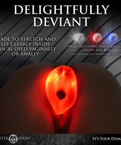 After doing any needed warm-up stretching, lube up the dilator and slip it inside. Place your fingers inside the tunnel to help guide it in until the sphincter squeezes around the neck and the toy stops at the flared base. To make things easier, have the LED light already inserted into the toy and turned on. Then enjoy pouring any fluids or liquids into the tunnel, or gaze into the gaping hole, or see if you can insert an anal-safe toy inside the tunnel for extra stimulation. Have fun with this illuminated booty and enjoy!