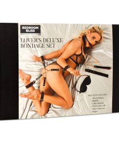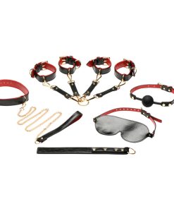 Spice things up with the Lover's Deluxe Bondage set! Within this one set is a ball gag, blindfold, collar, leash, wrists and ankle cuffs, a flexible slapper and hogtie connectors. The vegan leather is black and red and has a classy look that is accented by gold buckles. Enjoy the flexible slapper, sturdy wrist and ankle cuffs and adjustable collar.... Read more