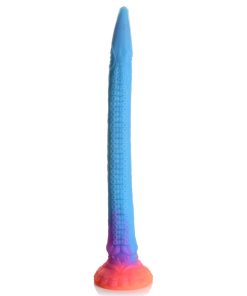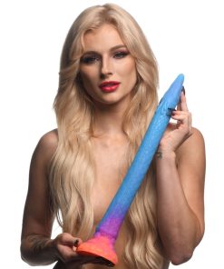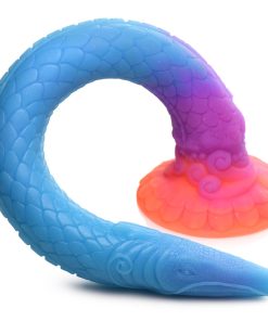 This may be the most beautiful anal hose you’ve ever seen! This 18 inch long dildo is perfect for snaking your drain, and this time it looks like a mystical sea snake! With a base that is sunburst colors of yellow and orange and a body that is shades of purple and blue, it also has fine, detailed designs along the body and glitter embedded in it, too! From the flower petal base to the scaled and sucker-covered body to the sea snake head that has gills, eyes and a mouth, this is a gorgeous toy you’ll be proud to show off or privately enjoy! Made out of premium, phthalate-free silicone, it has a firm core and is flexible and smooth. When exposed to UV light or sunshine, it also glows in the dark! Use the wide, suction-cup base to keep it in place and use it hands-free, or combine it with a compatible strapon harness for kinky cosplay, fantasy roleplay, or hot pegging play! After play is over, wash the dildo with warm water and soap and use a toy cleaner to spray clean. Wipe dry and store in a cool, dark place out of direct sunlight.