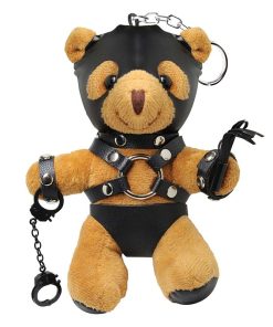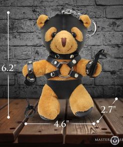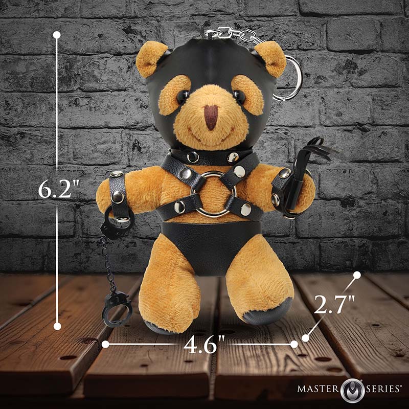 Introducing the Master Bear Keychain, your fun new companion! This charming plush bear has tan fur and is dressed in full bondage gear including a gimp-hood, harness, and underwear, complete with handcuffs and a flogger. It’s the ultimate travel buddy, effortlessly clipping onto your bag, purse, wallet, or even worn as an attention-grabbing accessory. With this bear by your side, you’re sure to showcase your fun-loving, adventurous spirit! This little bear is also the perfect gag gift for any occasion—birthdays, parties, White Elephant Gift Exchanges, or just to delight a kinky friend.