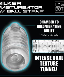 Squirt out your favorite water-based lube into the stroker and squeeze your shaft into that sexy little hole! As you pump your way to increasingly intense levels of pleasure, turn on your favorite erotic film, daydream about your crush, or simply check out how hot your dong looks in the semi-translucent sleeve! Pair it with the Milker Pro and go hands-free for an experience like you’ve never had before! Use the ball-strap to keep it in place as the Milker Pro does all the work for you!