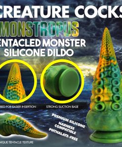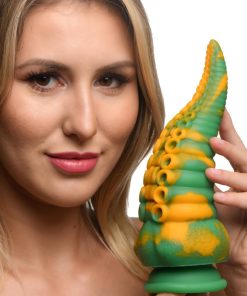 Let your fantasies run wild with tentacle-sex role-playing! This long, tapered dildo has a marble green, yellow and blue color that is unique to each dildo. Enjoy the dual rows of octopus suckers separated by a meaty ridge between each set of suckers. As you run your fingers, mouth or holes along the shaft, you’ll find round, circular ridges that go all the way to the wide base. Enjoy every inch of this premium silicone dildo! Use solo and hands-free by pressing the suction cup base against any flat surface or pair with a strapon harness for partner play!