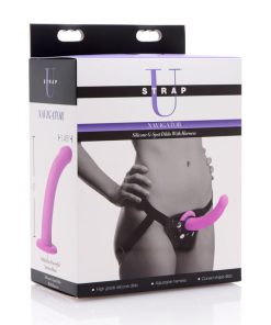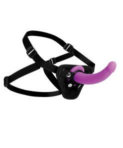 Perfect for pegging or vaginal sex, this strap-on set has everything you need for a comfortable and passionate penetration! Equipped with a sexy, adjustable harness and a silky, non-threatening dildo, you and your partner will be able to delve into new pleasure territory. The harness accommodates many sizes, wrapping seductively around the butt and thighs. A small pocket sits within the inner panel for adding a vibrating bullet if you choose. The dildo is curved for prostate or G-spot stimulation, with a tapered shaft that gradually increases in diameter. This, coupled with the smooth material, will allow for an easy insertion at your own pace. The dong can also be used on its own, with a suction cup base that is perfect for mounting to hard surfaces. Made of silicone, it is non-porous and phthalate-free. Sterilize with mild soap and warm water, but do not use with silicone lubricants.
