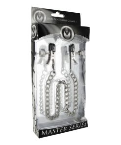 Attached to a single chain, once these bullnose style clamps are affixed to the nipples of your plaything, you can control just how much pleasure or pain they deserve. Simply adjust the level of intensity by turning the screw located near the tip of the clamp. Tips are coated in vinyl for added comfort and safety.