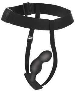 First, turn the vibrator on and let it pair with the remote. Then use plenty of lube on the toy and inside your derriere; it can help to use a lube shooter to get lubricant inside of you beyond the sphincter muscle. Connect the plug to the harness and then slowly push the plug into your hole, taking your time as you do. Make sure to have the curved end of the plug pointing towards your belly in order to stimulate your prostate! Once inside, adjust the harness straps and let yourself move around. Turn on the vibrator and give yourself the pleasure of feeling buzzed for as long as it’s inside! Hand the remote to a partner for them to control and play with you from across the room!