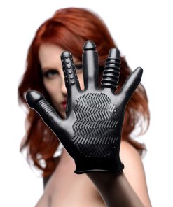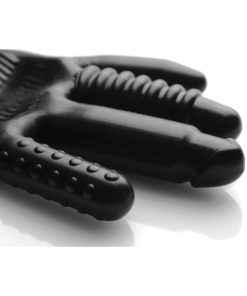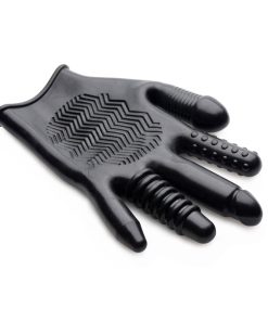 This textured glove is so versatile that it may become a staple in all of your sexual experiences! So many ways to use… finger, stroke, massage, or spank. Whether you are male or female, playing solo or with a partner, this glove will show you love! Each of the five fingers is uniquely shaped for a range of sensations during anal or vaginal insertion: smooth and tapered, bold ridges, penis-shaped, raised nubs, or bulbed with subtle ribbing. The palm has a zig-zag tread that brings extra excitement to a handjob or masturbation. Give your lover a sensual massage with the variety of textures or add a new element to your spankings! This double-sided glove works on both hands and is compatible with silicone and water-based lubricants. Clean with mild soap and water.